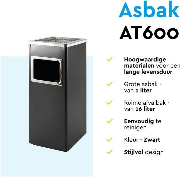 • Ontdek de BRASQ Asbak met Afvalbak AT600 - Zwart 16 Liter, dé stijlvolle en praktische oplossing voor schone en georganiseerde buitenruimtes. Met een duurzame constructie, slim ontwerp en een geïntegreerde grote asbak is deze staande asbak de perfecte keuze voor zowel particulier als zakelijk gebruik.