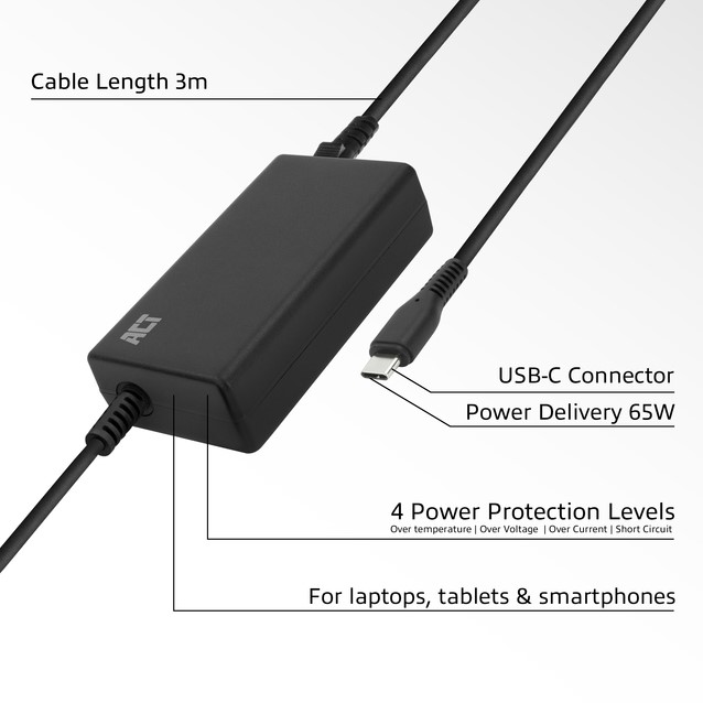 Laptop Oplader ACT USB-C Power Delivery 65W 3mtr