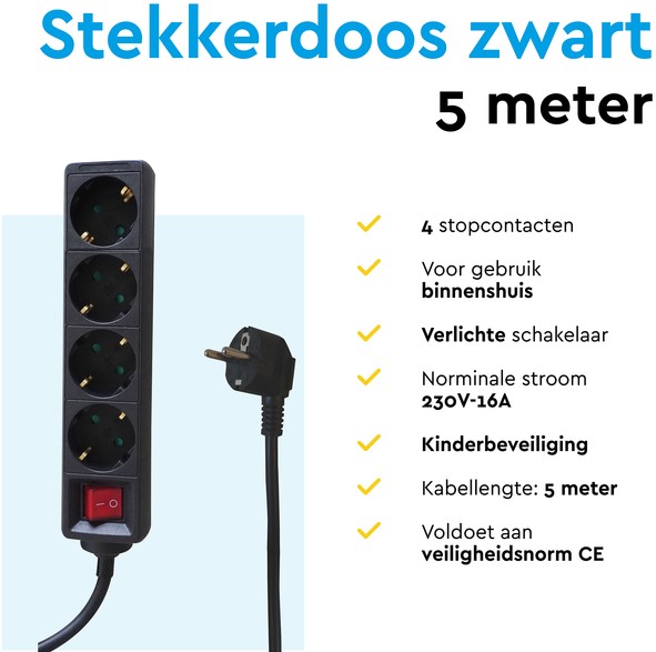 • Met zijn handige aan-uit schakelaar kun je gemakkelijk de toevoer van elektriciteit regelen, waardoor je zelf ook het energieverbruik in huis of kantoor bepaald. De schakelaar is uitgerust met verlichting, zodat je ook in het donker duidelijk kunt zien of de schakelaar is ingeschakeld of niet. De verdeeldoos heeft een kabellengte van 5 meter en een zwarte kunststof behuizing. Door de handige schuine plaatsing van de stopcontacten kunnen er makkelijker haakse stekkers op worden aangesloten.
