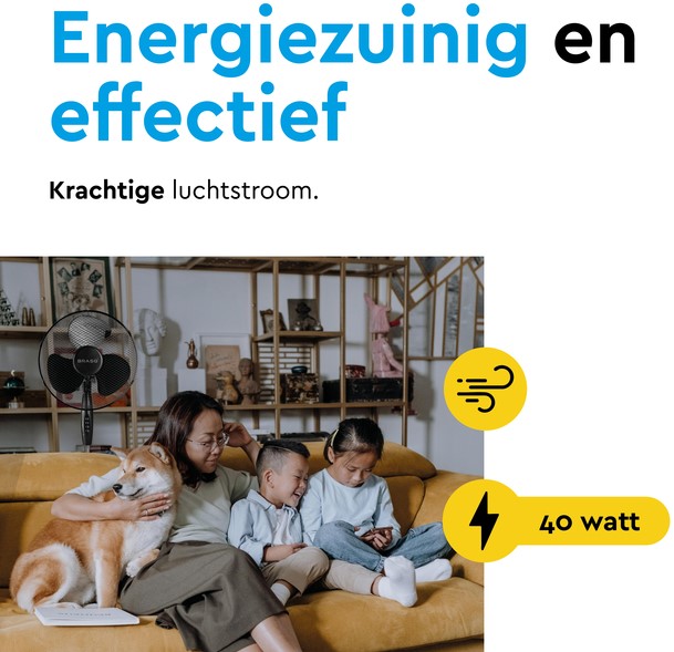 • Krachtige en instelbare luchtstroom. Met drie instelbare snelheidsstanden kies je eenvoudig de perfecte verkoeling. Of je nu een zachte bries of een krachtige luchtstroom nodig hebt, deze ventilator past zich aan jouw wensen aan. Dankzij de grote ventilatorbladen en een vermogen van 40 watt geniet je binnen enkele seconden van een aangename temperatuur.