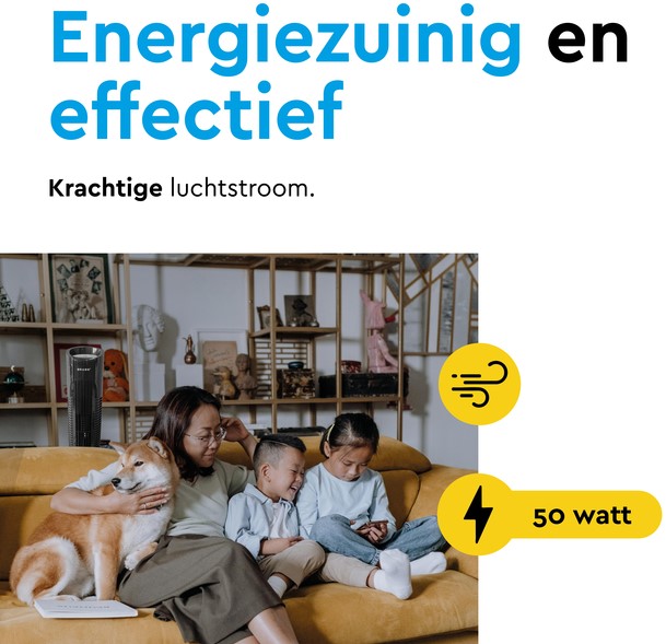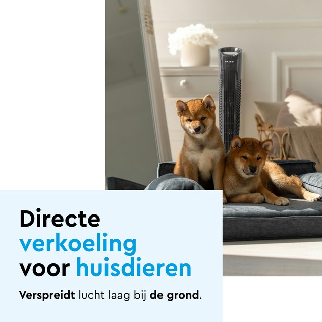 • Ideaal voor huisdieren en gehele ruimteverkoeling. Doordat deze kolomventilator ook laag bij de grond lucht verspreidt, is hij perfect voor huisdieren die verkoeling zoeken op warme zomerdagen. De stabiele vierkante voet zorgt ervoor dat hij stevig op zijn plek blijft staan.