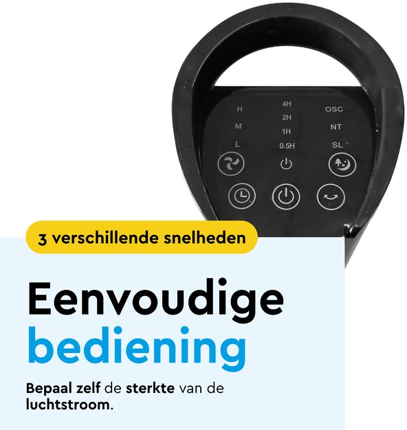 • Moeiteloze bediening met afstandsbediening. Pas alle instellingen aan zonder op te staan! Met de afstandsbediening stel je moeiteloos de snelheid, de oscillatiefunctie en de timer in. Liever handmatig bedienen? De handige knoppen bovenop de ventilator maken de bediening eenvoudig en gebruiksvriendelijk.