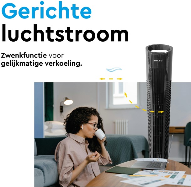 • BRASQ Torenventilator met Afstandsbediening – Stijlvolle verkoeling met één druk op de knop