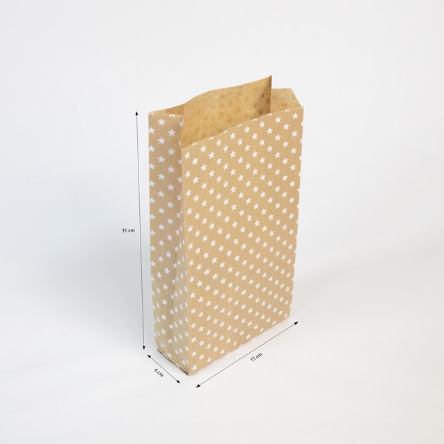 Kraft 50 zakjes 15x31+6cm Sterren. Direct effect gegarandeerd! Praktische en leuke geschenkzakjes, de 3 formaten passen zich aan alle gelegenheden aan (bruiloft, moederdag, vaderdag, verjaardag, enz.). Pak van 50 Kraft zakjes.