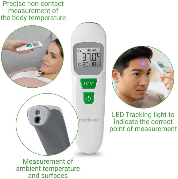 • De multifunctionele infraroodthermometer TM 760 van medisana kan worden gebruikt voor een snelle, nauwkeurige en contactloze meting van de lichaamstemperatuur. Naast het meten van lichaamswaarden kan de TM 760 ook worden gebruikt voor het meten van de omgevingstemperatuur en de temperatuur van oppervlakken (0 - 100 °C). Dankzij het visuele en hoorbare koortsalarm worden de gemeten waarden snel en duidelijk gecategoriseerd en is een betrouwbare bewaking gegarandeerd.