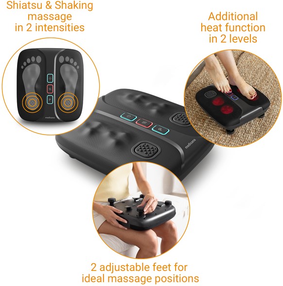 • Het 2-in-1 voet- en beenmassageapparaat van medisana biedt een verkwikkende en losmakende massage die de benen en voeten activeert en ontspant. Dankzij de twee geïntegreerde trilplaten in de hielzone worden de bloedsomloop en de lymfestroom gestimuleerd. Tegelijkertijd zorgt de Shiatsu-massage voor holistische ontspanning van de voetzolen.