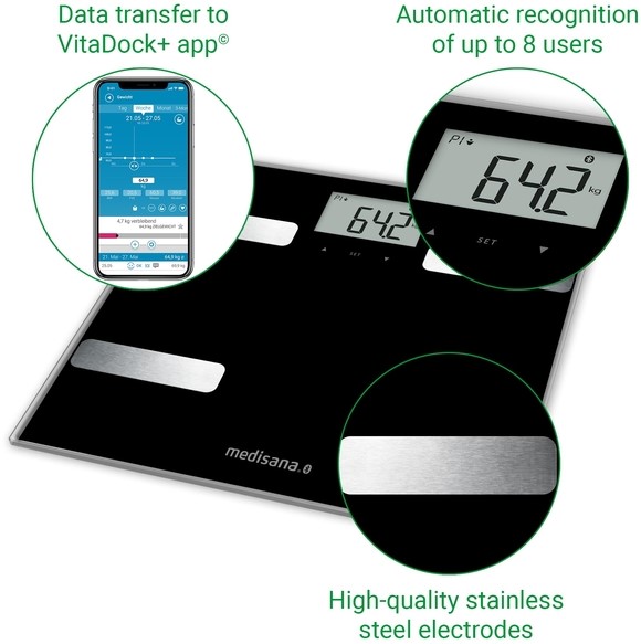 • De medisana BS A41 connect lichaamssamenstellingsmonitor is uitgerust met hoogwaardige roestvrijstalen elektroden. Hij beschikt over 30 geheugenplaatsen per gebruiker voor hersynchronisatie. Zoals bij alle medisana connect producten kunt u uw vitale gegevens dankzij de moderne Bluetooth gegevensoverdracht gemakkelijk overzetten naar de VitaDock+ app (iOS & Android) en VitaDock-Online en gebruiken voor verdere analysefuncties.