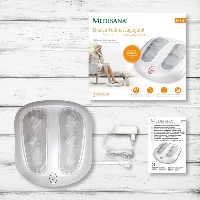 • Het Medisana FM 883 Shiatsu voetmassageapparaat laat je gestreste voeten weer ademen. Dankzij de rustgevende Shiatsu-massage kunnen je voetzolen en hielen ontspannen en nieuwe energie opdoen. De massages kunnen worden genoten in twee verschillende massage-intensiteiten - afhankelijk van hoe je je voelt gedurende de dag.