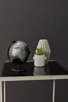 • De matte wereldbol, met een diameter van 13 cm, heeft een elegant tweekleurig ontwerp met zilverkleurige landoppervlakken en diepe zwarte zeeën.