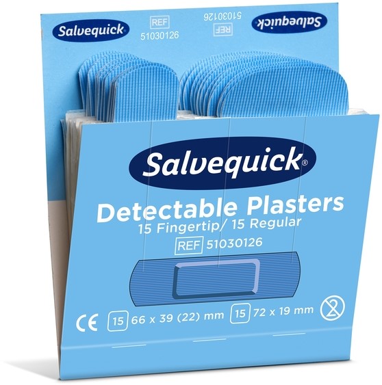 • Salvequick Blue Detectable pleisters zijn in het bijzonder bedoeld voor gebruik in de levensmiddelenindustrie. De pleisters zijn detecteerbaar en worden door de meeste metaaldetectors ontdekt. Door de blauwe kleur kan de pleister ook gemakkelijk visueel worden ontdekt.