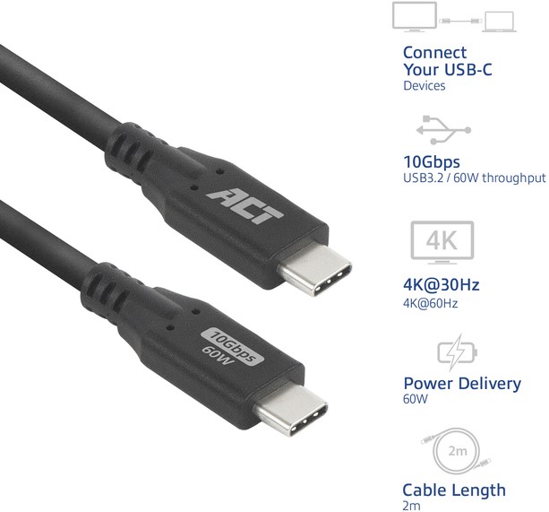 • Sluit USB-C apparaten aan met de AC7442 USB 3.2 10Gbps USB-C-kabel. De kabel haalt een maximale data overdrachtssnelheid tot 10Gbps en kan daarnaast 60W aan vermogen leveren door de Standard Power Range. De AC7442 ondersteunt DisplayPort Alternate Mode met een maximale resolutie tot 4K@60Hz en is overeenkomstig met USB 3.2, USB 3.1, USB 3.0 en USB 2.0.Data, power en video via één USB-C-kabelDe AC7442 USB-C-kabel kan overweg met zowel data, power en video. De kabel ondersteunt de USB 3.2 technologie en voor een maximale overdrachtssnelheid tot 10Gbps.Power Delivery: Standard Power Range 60WDe AC7442 ondersteunt de SPR (Standard Power Range) en kan 60W leveren.DisplayPort Alternate Mode protocolDe USB-C-kabel ondersteunt het DisplayPort Alternate Mode 1.4 (DP Alt Mode) protocol voor het distribueren van video. De AC7442 ondersteunt een maximale resolutie van 4K@60Hz..Eigenschappen;