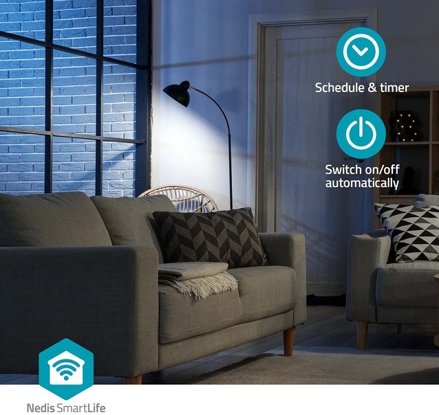 • Schakel elk product met een stekker (bijv. een lamp, radio, ventilator, waterkoker, verwarmde deken) eenvoudig van je smartphone, waar je ook bent of met een eenvoudige spraakopdracht naar uw Google Home of Amazon Alexa-apparaat. Bediening met Siri (Opdrachten) is ook mogelijk. Naast het live bedienen kun je ook een schema instellen om op voorkeurstijden aan/uit te schakelen, of op basis van zonsopkomst/zonsondergang. Dit kan worden gedaan voor je eigen gemak wanneer je thuis bent, of om je aanwezigheid te simuleren terwijl je eigenlijk niet thuis bent om inbrekers af te schrikken. Door meerdere slimme stekkers of andere producten uit het Nedis SmartLife assortiment te combineren, kunt je slimme scènes maken die in één keer kunnen worden geactiveerd, of automatiseringen die worden geactiveerd door een camera, knop, bewegingssensor of rookmelder. Timer en schema functie: Dankzij de timerfunctie schakelen uw apparaten automatisch uit of kunt u een weekschema instellen om het apparaat in en uit te schakelen. Dit scheelt tijd en natuurlijk veel energie, want je apparaten draaien alleen als je ze echt nodig hebt. In de Nedis SmartLife app maak je eenvoudig schema's voor als je niet thuis of op vakantie bent. Je kunt een lamp of de tv inschakelen om uw aanwezigheid te simuleren en inbrekers ervan te weerhouden in te breken.