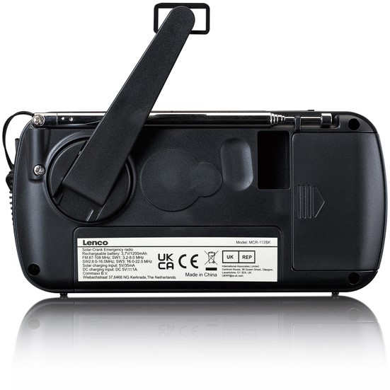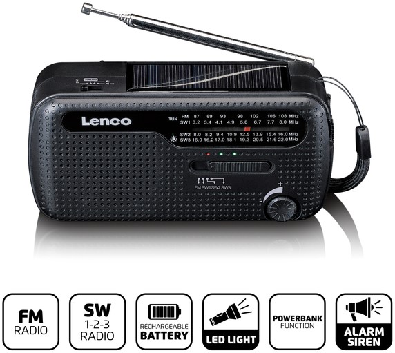 • Deze MCR-113BK noodradio van Lenco is een alles-in-één draagbare radio met meerdere praktische functies. De radio kan namelijk ook gebruikt worden als zaklamp of powerbank. Het grootste voordeel van deze radio is dat er geen stopcontact in de buurt hoeft te zijn en dat je geen batterijen nodig hebt. Je kunt namelijk de benodigde stroom zelf genereren door de handslinger te gebruiken of het zonnepaneel bovenop de radio om hem op te laden. Mocht er toch stroom in de buurt zijn, dan is het ook mogelijk om de Lenco MCR-113BK op te laden met een USB-C kabel.