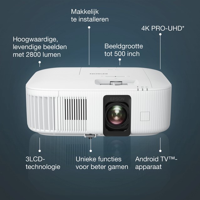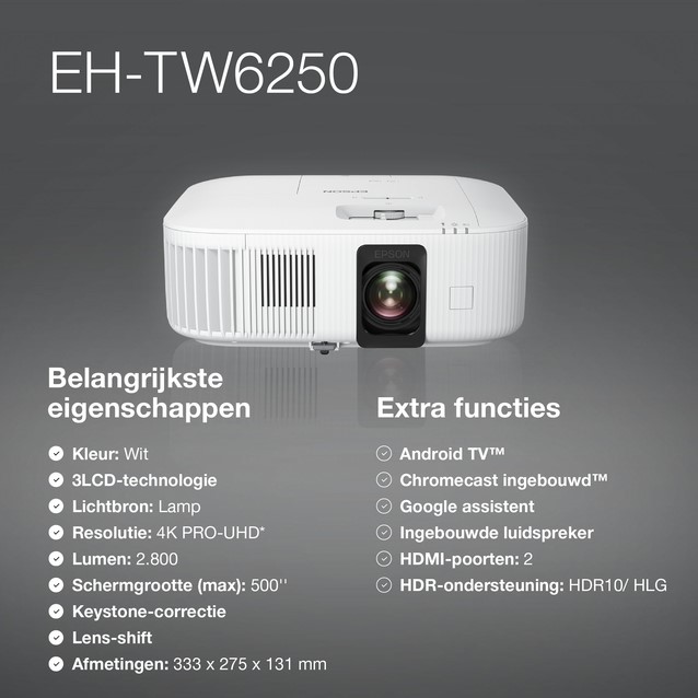 • Geniet van het unieke bioscoopgevoel:Projecteer uw favoriete games, films en sportevenementen thuis in supergroot formaatMakkelijk te installeren: x1,6 zoom, horizontale en verticale keystone-correctieDuurzame oplossing:Geniet 15 jaar lang van vlijmscherp entertainment (Gebaseerd op het dagelijks bekijken van een film meteen gemiddelde duur van 1 uur en 45 minuten, met de lampingesteld op Eco-modus)Indrukwekkend heldere weergave:Een even hoog lichtrendement van wit en gekleurd licht van 2800 lumen.