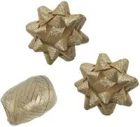 Setje van één polyband eitje, en twee rozetten. Afmeting eitje: 5mmx20m. Afmeting rozetten: 15mm lint, Ø75mm. Kleur: glitter goud.