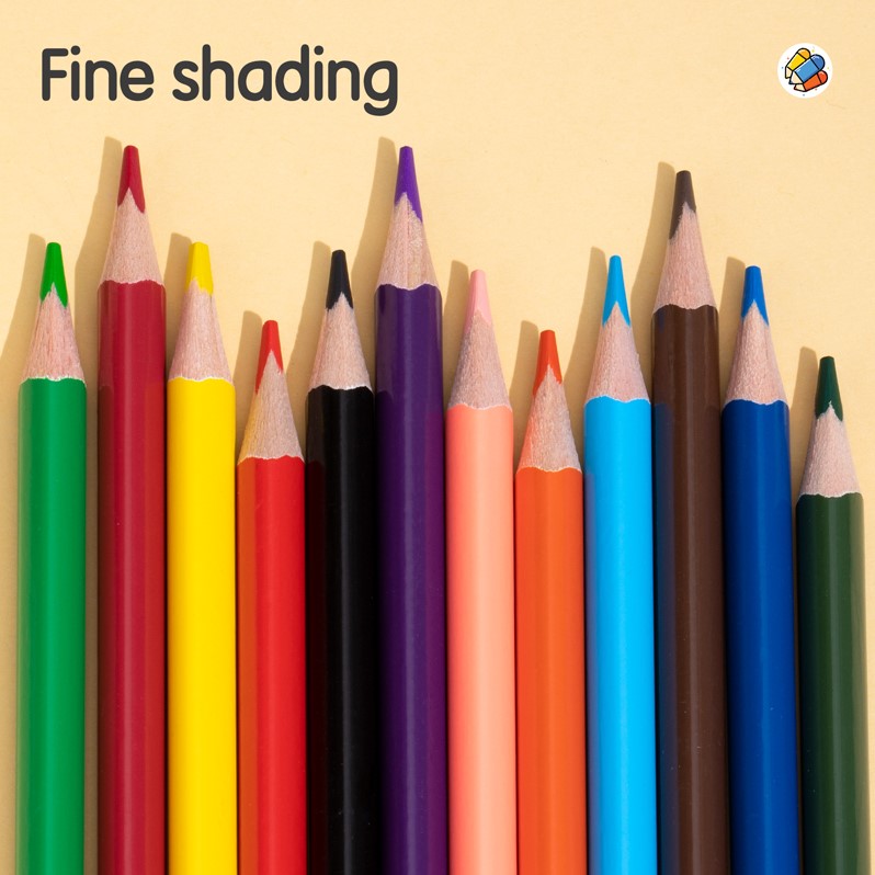 De kleurpotloden hebben een 2,9 mm kern die zorgt voor een goede kleurafgifte zonder snel te breken. Dankzij de driehoekige vorm liggen ze prettig in de hand en bieden ze extra grip tijdens het tekenen. De potloden zijn gemaakt van verzacht populierenhout, waardoor ze eenvoudig te slijpen zijn. Elk potlood is voorgeslepen en direct klaar voor gebruik. De afgewerkte, gesneden kop zorgt voor een nette en duurzame afwerking.