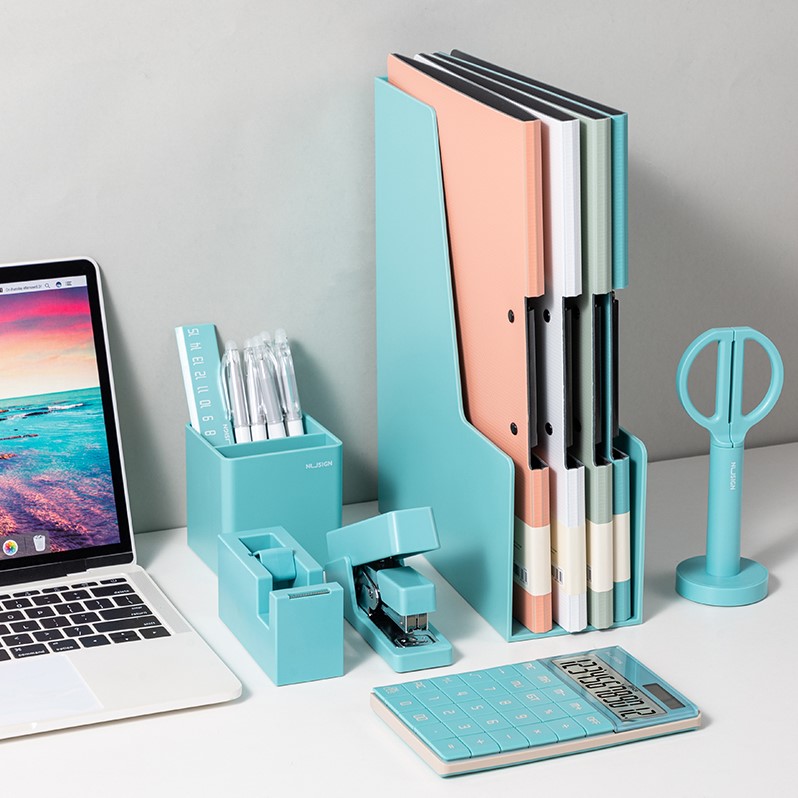 De set bestaat uit 13 functionele onderdelen die samen voorzien in alle basisbehoeften op het bureau. Denk aan een schaar, liniaal, rekenmachine, nietmachine, tapehouder, penhouder, boekenstandaard en 6 desktop opbergdoosjes. Alles is uitgevoerd in een minimalistische groene stijl en verpakt in een luxe geschenkdoos, ideaal als cadeau of voor een representatieve werkplek.