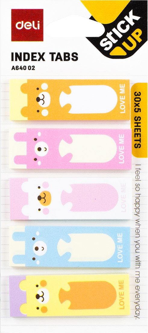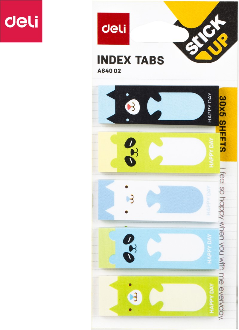 De tabs zijn gemaakt van 80 g/m² papier en hebben een sterke maar verwijderbare kleeflaag, waardoor ze goed blijven zitten en toch schoon te herpositioneren zijn. Elke set bevat 5 blokjes van 30 tabs met cartoonfiguren zoals hondjes, beren en andere vrolijke vormen. De fantasievolle vormen maken het organiseren overzichtelijker en leuker. De tabs worden geleverd met een kartonnen houder en hebben een houdbaarheid van 24 maanden.