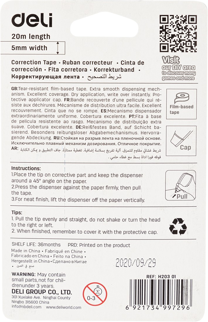 De tape biedt uitstekende dekking en wordt droog aangebracht, waardoor je er direct overheen kunt schrijven zonder wachttijd. Dankzij de beschermkap blijft de applicator schoon en beschermd wanneer hij niet in gebruik is. Met een lengte van 20 meter gaat deze correctietape extra lang mee en is hij zeer praktisch bij veelvuldig corrigeren.