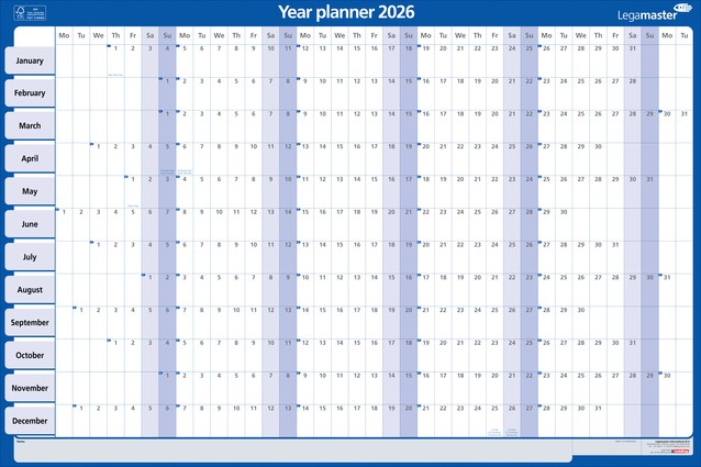 Engelstalige jaarplanner van 60x90cm. Het gebruik van een jaarplanner is een praktische en visueel aantrekkelijke manier om je planning, evenementen en taken voor het jaar te organiseren. Hang op een zichtbare plek: Zoek een prominente plek in je huis of kantoor. De laminering beschermt het karton tegen slijtage en maakt de planner duurzamer en zorgt voor een langere levensduur. Op het gladde, beschrijfbare oppervlak van het gelamineerde karton kun je eenvoudig schrijven en wissen bij gebruik van droog uitwisbare markers. Markeringen kunnen eenvoudig worden gewist met een vochtige doek of een gum. Jaarplanner met de dagen aan de bovenkant (alleen de eerste twee letters) en de maanden langs de zijkant. Weekends zijn in een andere kleur gemarkeerd. Extra ruimte voor aantekeningen aan de rechterkant van de planner. Weeknummers zijn in het design opgenomen. Afmeting raster ongeveer: H42 x W22 mm. Algemene feestdagen zijn voorbedrukt. Accessoireset inbegrepen: 1 TZ111, boardmarker, 3 vellen met stickersymbolen (rood, blauw, groen), 1 set Tesa Poster Powerstrips voor eenvoudige wandmontage (4 ST). Eenvoudige wandmontage met Tesa Poster Powerstrips. Deze jaarplanner is gemaakt van materiaal uit goed beheerde, FSC®-gecertificeerde bossen en andere gecontroleerde bronnen (FSC C158462). Dit product wordt geleverd in eenkartonnen en plasticvrije verpakking. Geproduceerd in de Europese Unie.