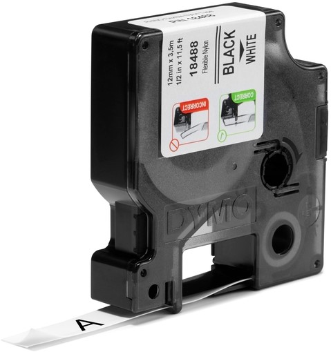 Labeltape Dymo Rhino industrieel nylon 12mm zwart op wit