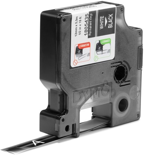 Labeltape Dymo Rhino industrieel vinyl 12mm wit op zwart