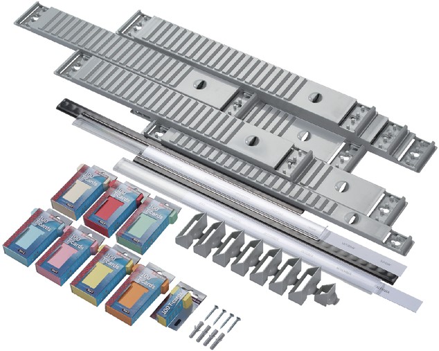 • Complete planningsset met 7x planbordelementen formaat 2 (48 mm), 1x indexpaneel formaat 1 (15 mm), 2x verbindingsprofielen (472,5 mm), 8x T-kaarthouders.
