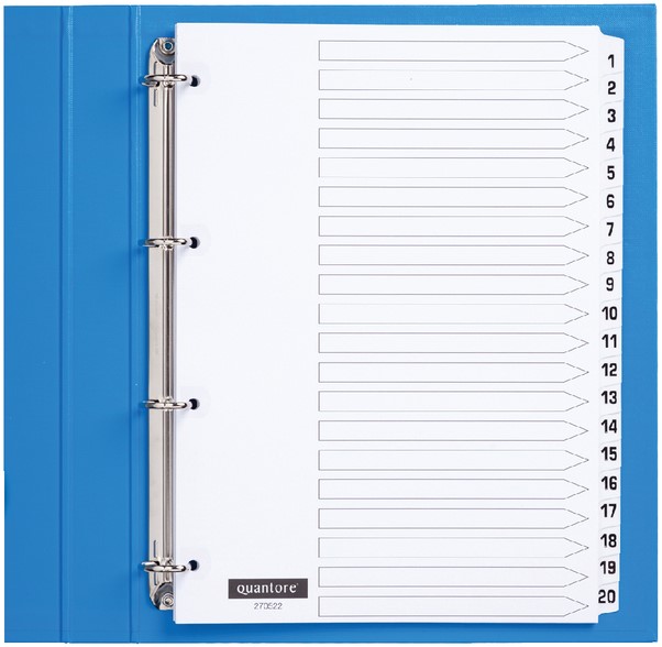 • De Quantore tabbladen 4-gaats 1-20 genummerd wit karton zijn perfect voor het overzichtelijk indelen van grotere documentenbundels. Deze tabbladen zijn vervaardigd uit hoogwaardig wit 170 grams karton en bieden een nette, professionele uitstraling. De tabs en ponsgaten zijn verstevigd met glashelder kunststof voor extra duurzaamheid. Verkrijgbaar met aan twee zijden bedrukte tabs of in een uitvoering met gekleurde blanco tabs, zodat je altijd de juiste stijl kunt kiezen. FSC-gecertificeerd, dus ook een verantwoorde keuze voor het milieu.Kenmerken: