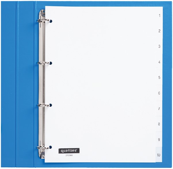 • De Quantore tabbladen 4-gaats 1-10 genummerd wit zijn een praktische en duurzame oplossing voor het ordenen van je documenten. Deze tabbladen zijn vervaardigd uit stevig ivoorkleurig polypropyleen en ontworpen voor dagelijks gebruik in ringbanden of ordners. De tabs zijn genummerd van 1 tot 10 en eenzijdig zwart bedrukt, wat het terugvinden van informatie eenvoudig maakt. Dankzij de standaard 4-gaats perforatie passen ze in alle gangbare mappen. Ideaal voor het structureren van rapporten, werkdossiers of studiemateriaal met een professionele uitstraling.Kenmerken: