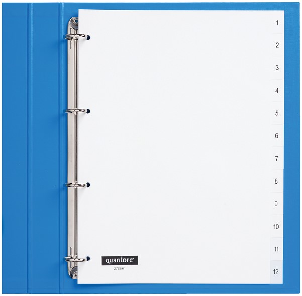 • De Quantore tabbladen 4-gaats 1-12 genummerd wit zijn ideaal voor het ordenen van documenten per maand of in twaalf overzichtelijke secties. Deze tabbladen zijn vervaardigd uit stevig ivoorkleurig polypropyleen en bieden langdurige kwaliteit voor dagelijks gebruik. De tabs zijn duidelijk genummerd van 1 tot 12 en eenzijdig zwart bedrukt, wat zorgt voor snelle en gemakkelijke navigatie. Dankzij de 4-gaats perforatie passen ze perfect in alle standaard ringbanden. Een praktische keuze voor wie structuur en overzicht in zijn administratie of projectdossier wil aanbrengen.Kenmerken: