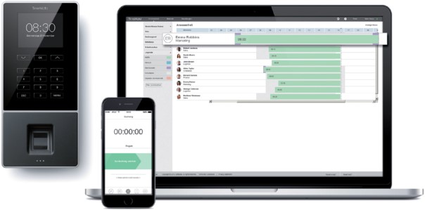 • Inklokken met vingerafdruk, RFID badge of pincode.