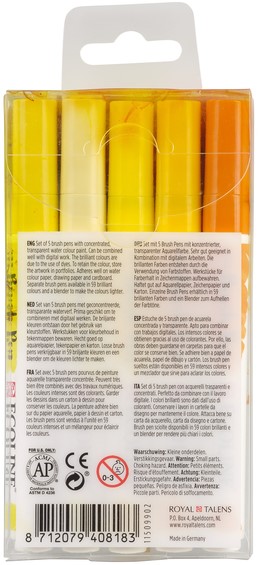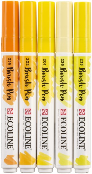 • Set "Geel" met 5 Talens Ecoline Brush pens in de kleurenlichtgeel (201), donkergeel (202), pastelgeel (226), chartreuse (233) en lichtoranje (236) in een kunststof etui.