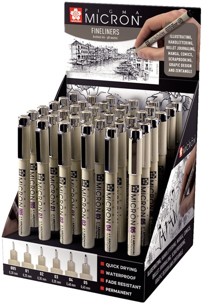 • De Sakura Pigma Micron Fineliners is ideaal voor technische en artistieke toepassingen. Display bestaat uit 36 fineliners met diverse lijndiktes.
