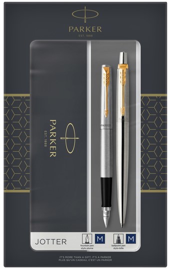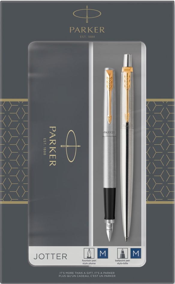 Balpen en vulpen Parker Jotter stainless steel GT medium 2 stuks