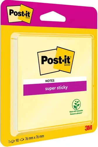 • Post-it® Super Sticky Notes hebben tweemaal zoveel kleefkracht (vergeleken met de originele Post-it® Notes). Ze zijn bijzonder sterk en uiterst veelzijdig en verkrijgbaar in verschillende zachte, felle of levendige kleuren die elke informatie of bericht laten opvallen.