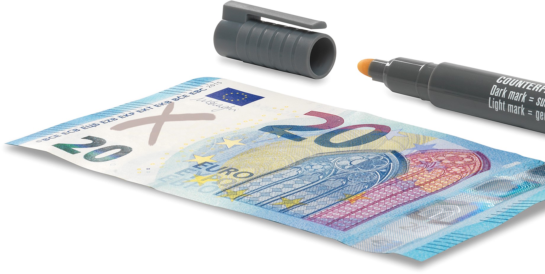 Met de valsgelddetectiepen Safescan 30 controleert u ter plekke of een bankbiljet echt is of vals. Markeer het bankbiljet en wacht enkele seconden. Wordt de inkt donker? Dan is het bankbiljet waarschijnlijk vals. De Safescan 30 is het perfecte hulpmiddel voor bijvoorbeeld marktkooplui, taxichauffeurs, maaltijdbezorgers en op evenementen.