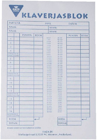 • Klaverjassen scoreblok met 50 vellen.