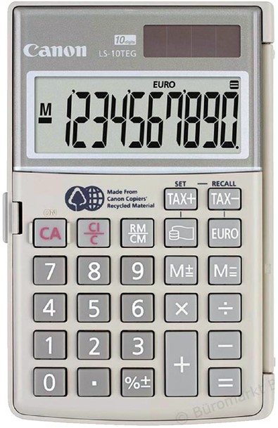 • Deze milieubewuste 10-cijferige handheld-rekenmachine met BTW- en eurofuncties is gemaakt van gerecycled materiaal van Canon voor milieubewuste bedrijven en consumenten.