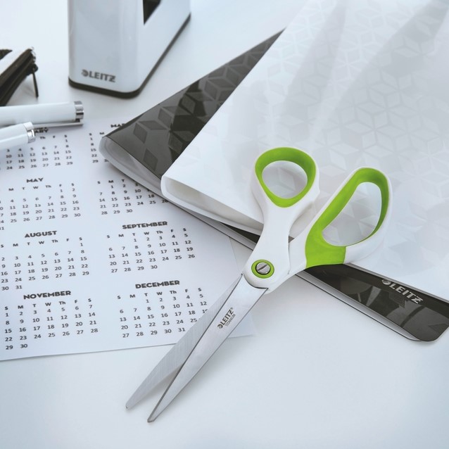 • Schaar WOW Leitz kleur groen met titanium coating. De duurzame bladen met titanium coating blijven veel langer scherp dan standaard bladen. Met comfortabele ergonomische zachte handgreep in opvallende en stijlvolle WOW-kleuren. Op plasticvrije ophangkaart.