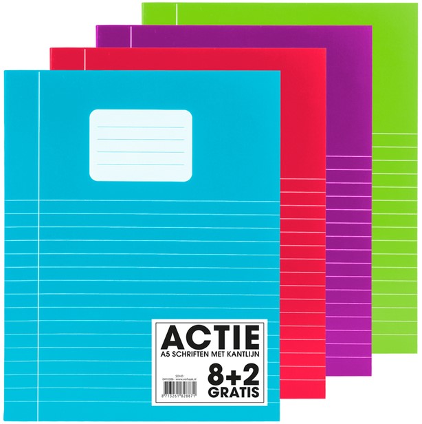 • Voorzien van een kantlijn en 70gr wit gelinieerd papier. Een promo actie 8 schriften met 2 gratis.