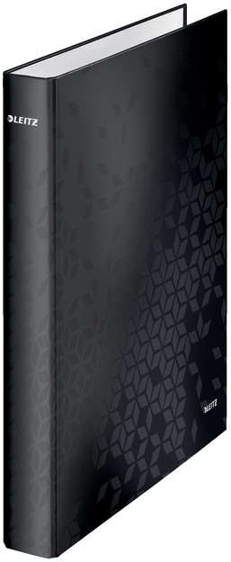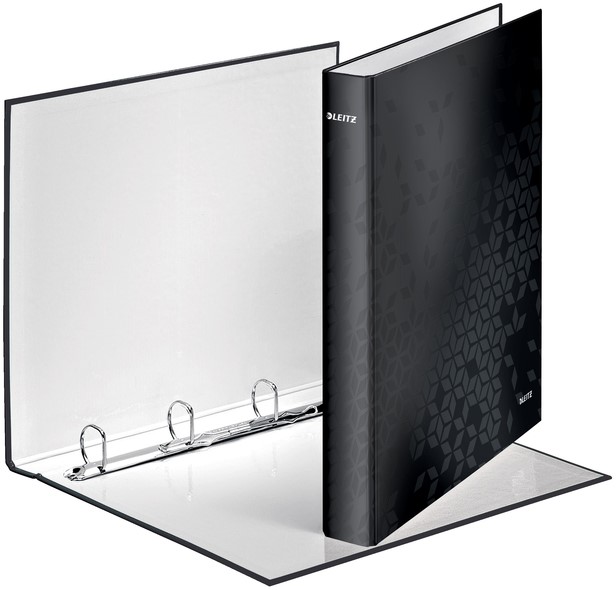 • Onze Leitz WOW ringband heeft een opvallend geometrisch patroon en is de perfecte keuze voor iedereen die op zoek is naar een stijlvolle en functionele oplossing voor het organiseren van documenten. Perfect te combineren met andere WOW-range producten. Deze 4 rings map is gemaakt van robuust en stevig grijs karton, overtrokken met zwart bedrukt papier en afgewerkt met een transparante folie.