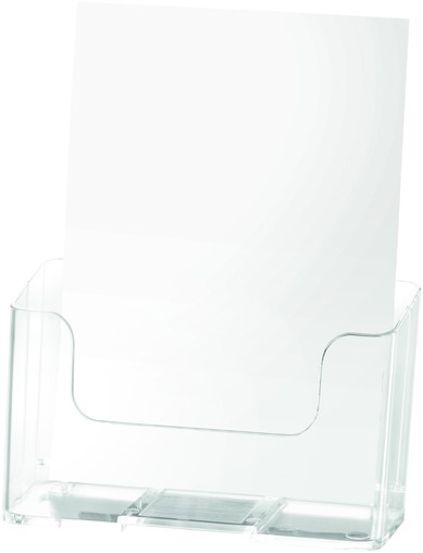 • Met de folderhouder van Quantore A5 presenteer je folders en flyers netjes en professioneel. Dankzij de transparante uitvoering is je communicatiemateriaal volledig zichtbaar en trekt het direct de aandacht. De opening aan de bovenzijde maakt het eenvoudig om folders te plaatsen of te vervangen. De lichte buiging naar achteren zorgt voor een optimale leeshoek, terwijl de stabiele onderkant voorkomt dat de houder verschuift. Gemaakt van stevig polystyreen is deze folderhouder ideaal voor winkels, kantoren, beurzen en andere openbare ruimtes.kenmerken: