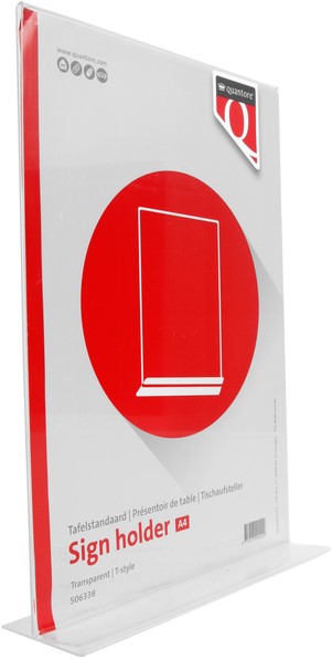 • Met de kaarthouder van Quantore A4 T-staand presenteer je flyers, mededelingen of posters altijd netjes en professioneel. De transparante houder is gemaakt van stevig polystyreen en zorgt ervoor dat je boodschap aan beide zijden perfect zichtbaar is, terwijl deze beschermd blijft tegen stof en vuil. Dankzij de opening aan de onderkant plaats je flyers eenvoudig en blijven ze stevig op hun plek. De stabiele onderkant garandeert dat de houder stevig staat op tafels, balies of toonbanken. Ideaal voor kantoren, winkels, horecagelegenheden en beurzen.kenmerken: