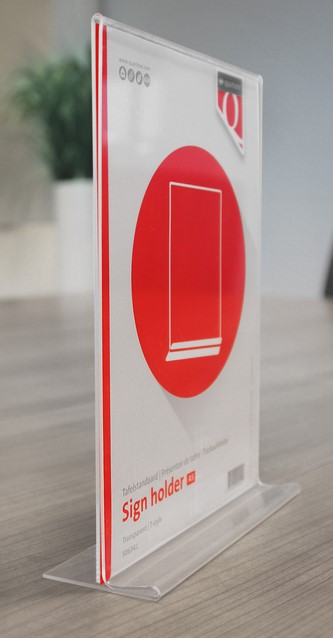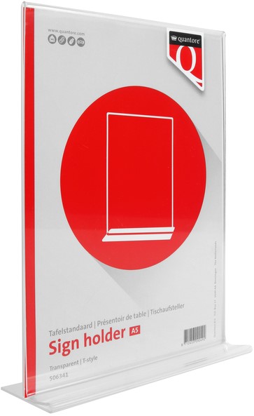 • Met de kaarthouder van Quantore A5 T-staand presenteer je flyers, mededelingen of kleine posters altijd netjes en professioneel. De transparante houder is gemaakt van stevig polystyreen en zorgt ervoor dat je boodschap aan beide zijden perfect zichtbaar is, terwijl deze beschermd blijft tegen stof en vuil. Dankzij de opening aan de onderkant plaats je flyers eenvoudig en blijven ze netjes op hun plek. De stabiele onderkant garandeert dat de houder stevig staat op tafels, balies of toonbanken. Ideaal voor kantoren, winkels, horecagelegenheden en beurzen.kenmerken: