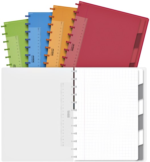 • A4 ADOC ringschrift met 144 geruite (5x5mm) bladzijden van extra wit 90gr PEFC schrijfpapier waarop iedere pen zich thuis voelt en met 6 tabbladen, die door de 12 ADOC ringen eenvoudig van positie kunnen gewisseld, toegevoegd of weggenomen worden.