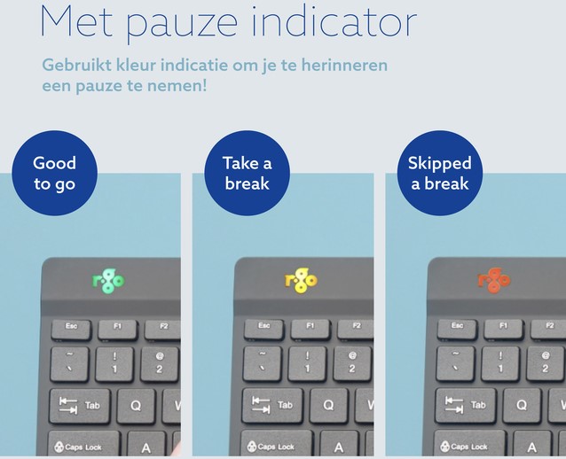 • De LED- kleursignalen in het toetsenbord geven aan hoe gezond je werkt en wanneer het tijd is voor een pauze. Tijdens het typen verandert het lampje van kleur, zoals bij een stoplicht. Groen betekent ‘goed bezig’, oranje dat het tijd is voor een pauze, rood dat je te lang hebt doorgewerkt. Door deze subtiele kleursignalen ontvang je op een eenvoudige en positieve wijze feedback over je pauzegedrag.