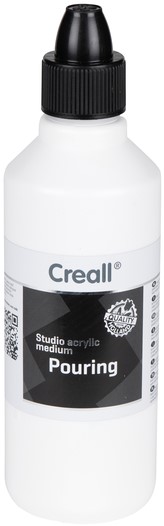 • Mengverhouding: 1 deel acrylverf op 1 deel medium, gedoseerd water toedienen tot je met het mengsel kan gieten.